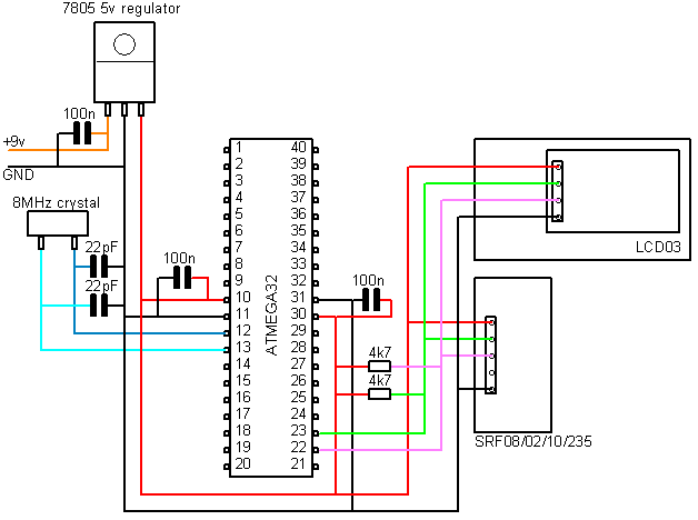These examples are designed to demonstrate how to use a ATMEGA32 to communicate with our modules. All the modules which use the I2C bus have pull-up resistors to 5v. You only need one set of resistors for the whole I2C bus regardless of however many I2C devices you have connected to it. You can find more information about the I2C bus in our I2C tutorial.