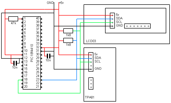The TPA81 connects to the PIC18F4410 using the I2C bus. This