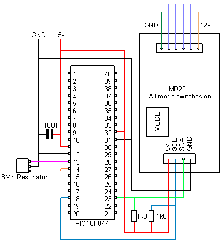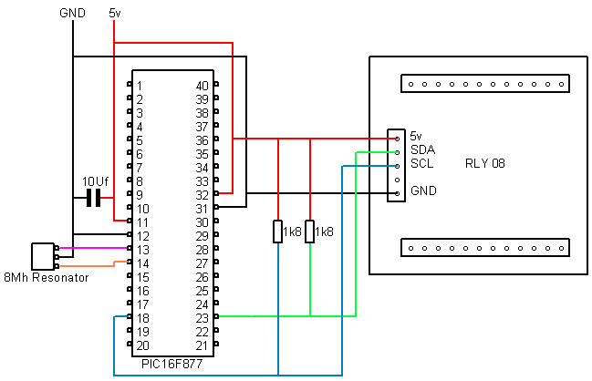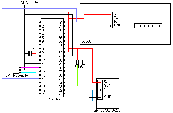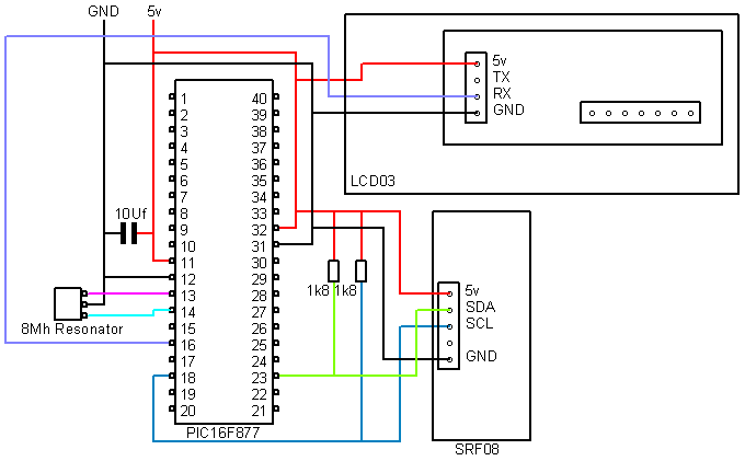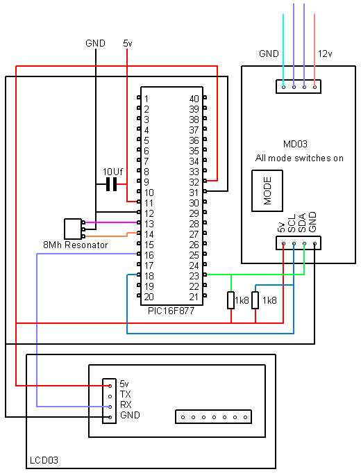 These examples are designed to demonstrate how to use a PIC16F877 and PicBasic PRO to communicate with our modules, most of these examples use the LCD03 display module to show the results. All the modules which use the I2C bus have 1k8 pull-up resistors to 5v. You only need one set of resistors for the whole I2C bus regardless of however many I2C devices you have connected to it. You can find more information about the I2C bus in our I2C tutorial.