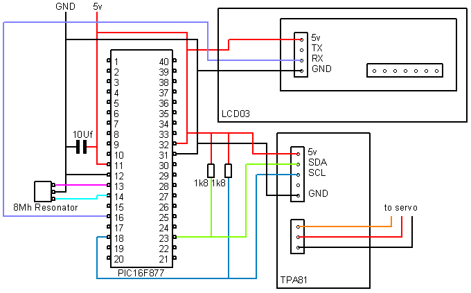 The TPA81 connects to the PIC16F877 using the I2C bus. This example displays the